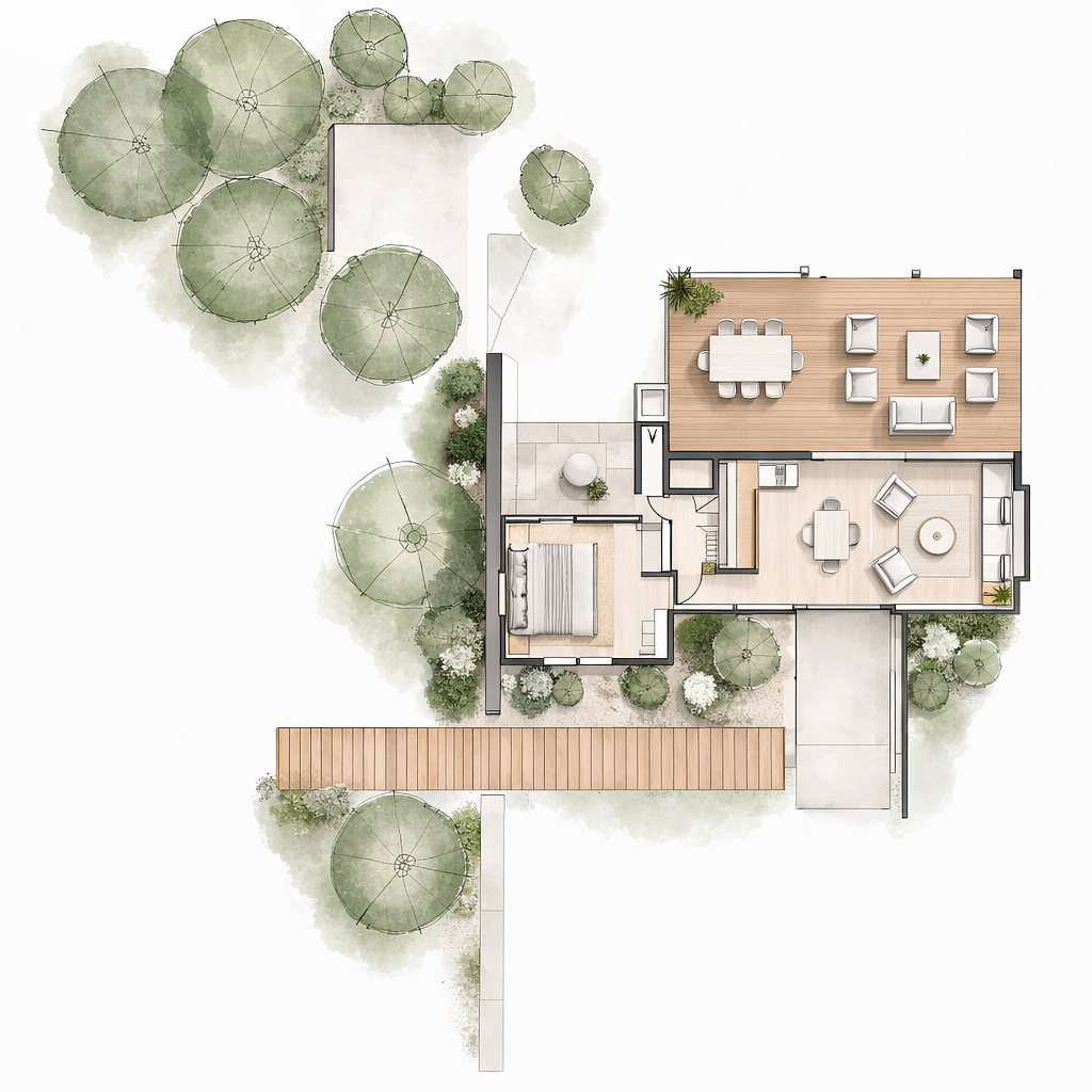 Version #2 creates a more private bedroom and bathroom suite, with the kitchen and living room areas combined in a great-room style space on a tiny-home scale. The extension of outdoor living from all sides brings the outside in, and expands the daily living areas. The bedroom retains more privacy including an outdoor shower and private patio.