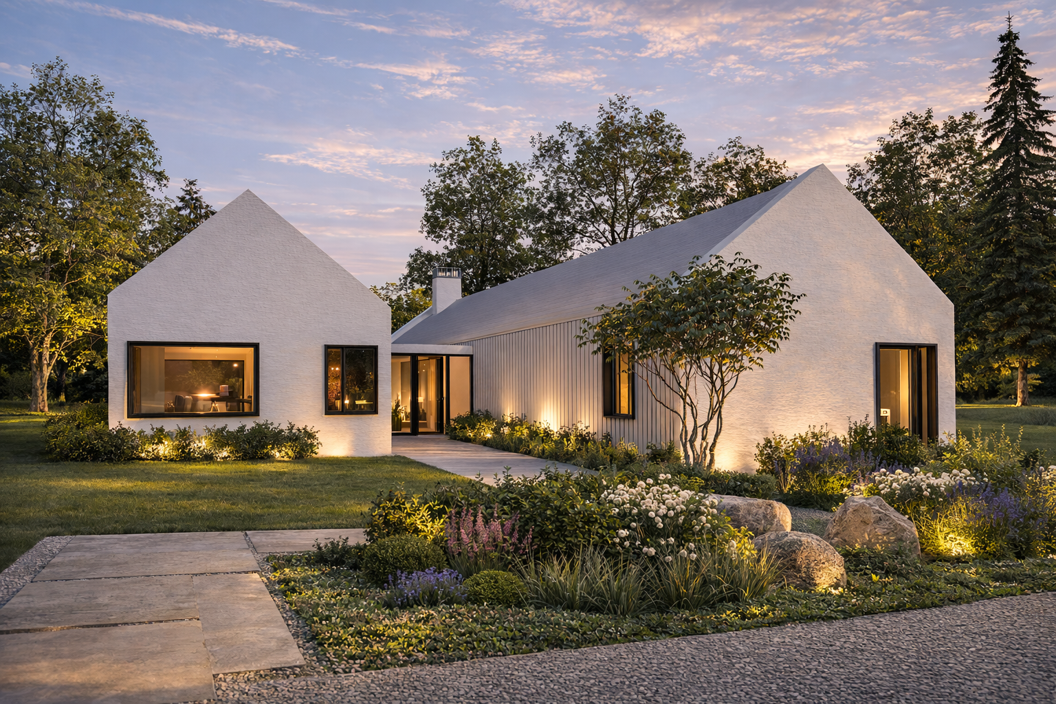 Clad in a nuanced combination of smooth stucco and vertically articulated wood siding, the facade balances solidity with texture. The subtle interplay of these materials creates a quiet tension, lending depth and movement to the approach while anchoring the house within its natural setting.