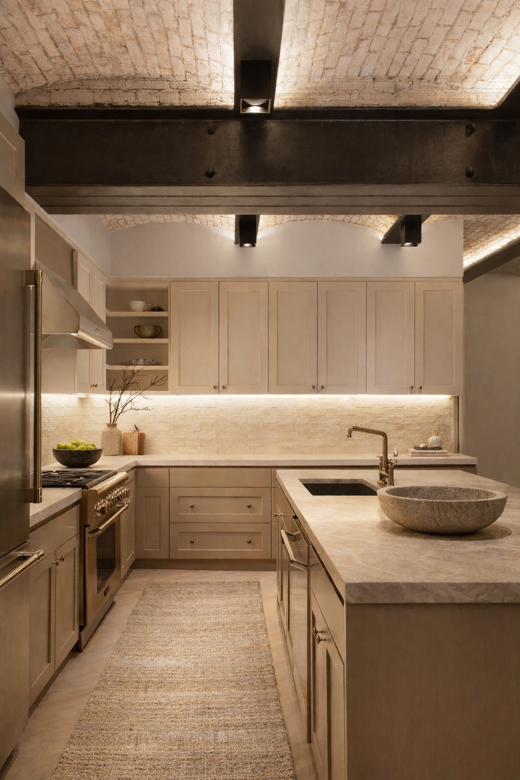 The resulting five bedroom dwelling pays homage to many of the building’s original details: the vaulted ceiling was stripped of stucco veneer and restored incorporating a lighting system to accentuate the curved brick; the steel support columns were sandblasted and ebonized; and wooden beams were revealed under endless layers of paint. The 19th century elements serve to ground the space historically, and create the perfect counterpoint to VMAD’s decidedly 21st century design.